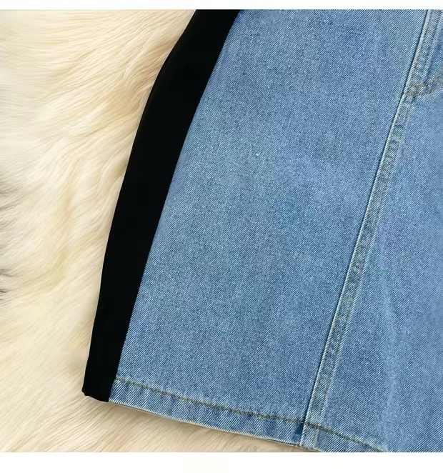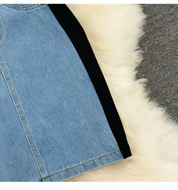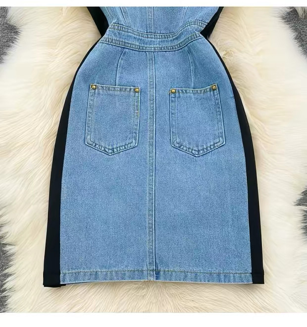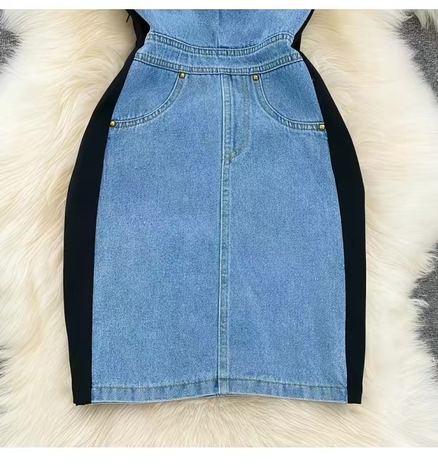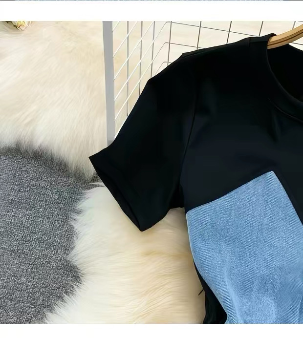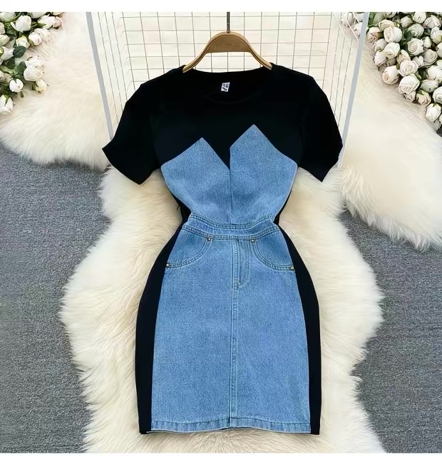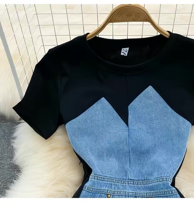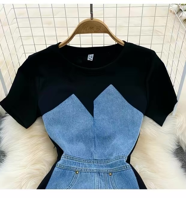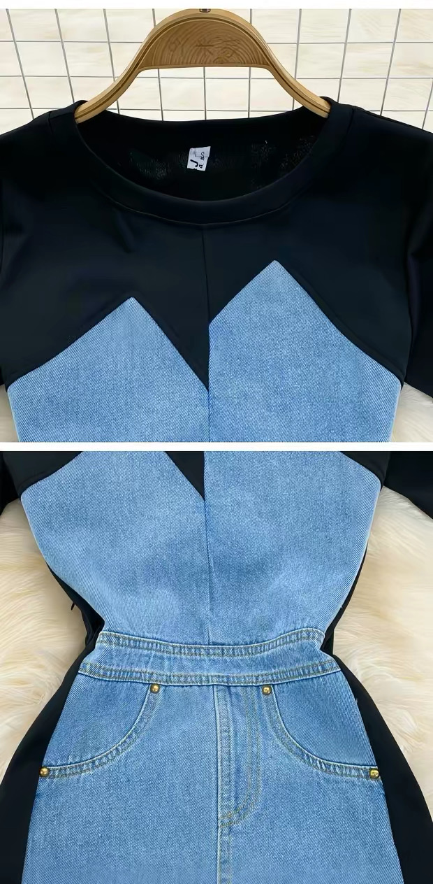 This fashionable bodycon mini dress features a unique mixed-material design combining soft stretch black fabric with structured light denim paneling for a flattering, sculpted silhouette. The short sleeves and round neckline offer a casual yet chic look, while the fitted waist and contoured sides enhance your natural shape. The denim front panel includes subtle pocket details, adding both style and functionality. Perfect for day-to-night wear, this dress blends comfort and trend effortlessly. The color combination includes classic black with a light blue denim contrast, making it a standout piece in any wardrobe.