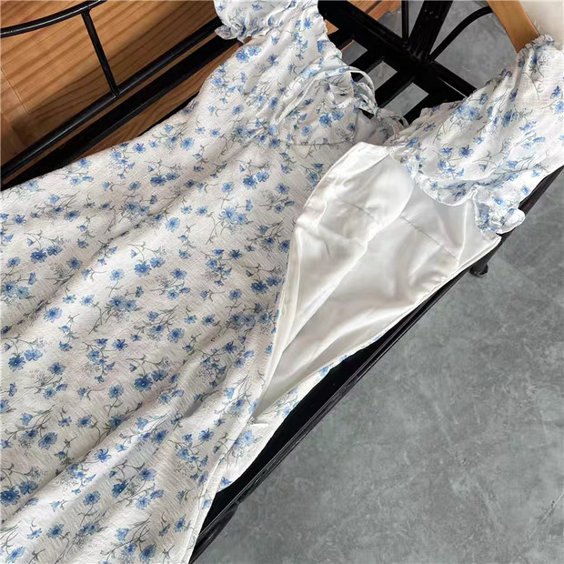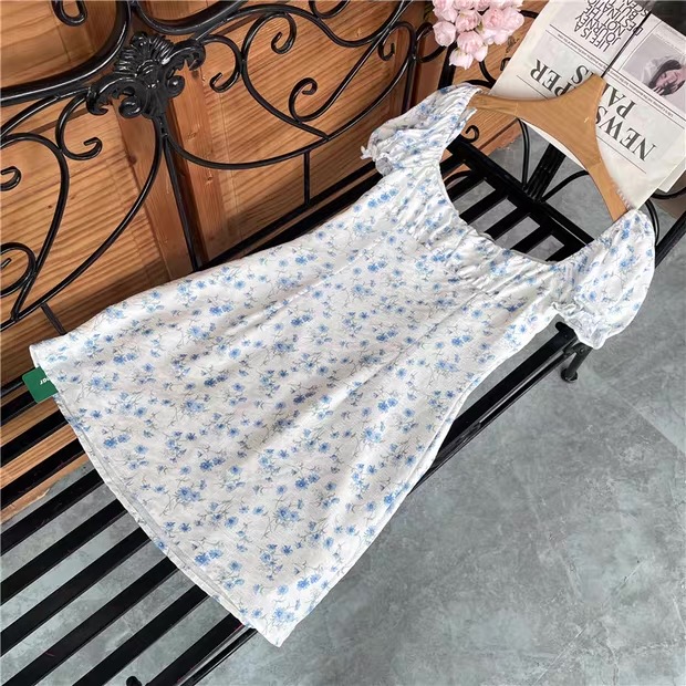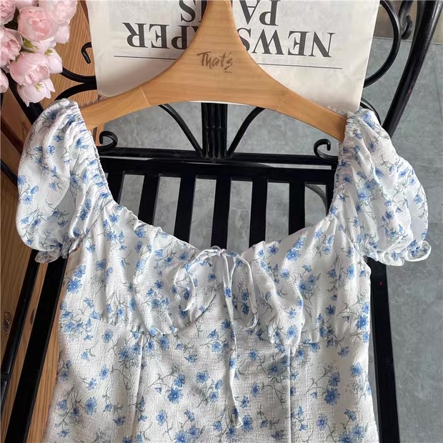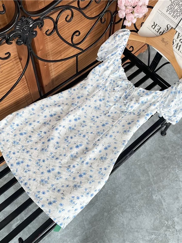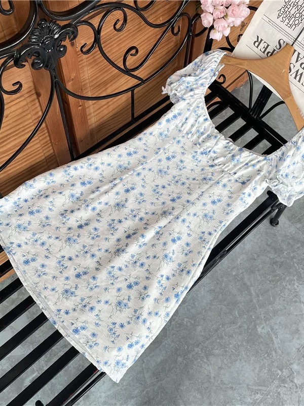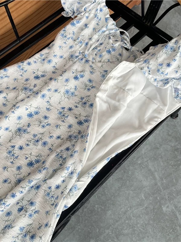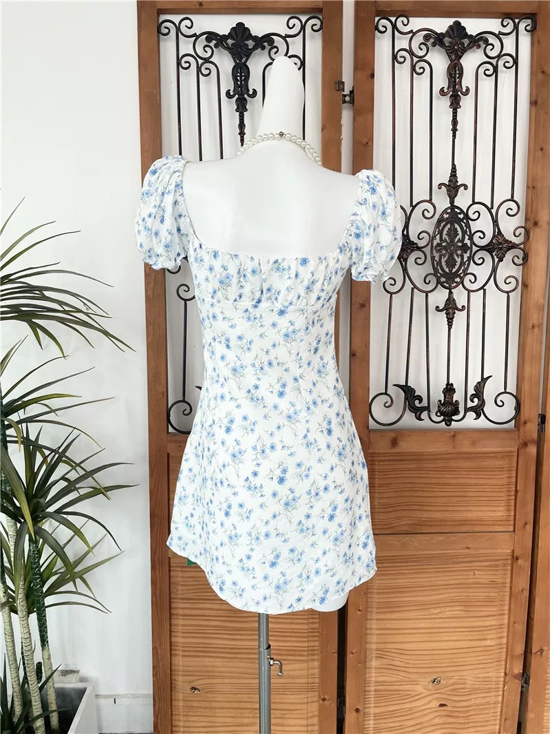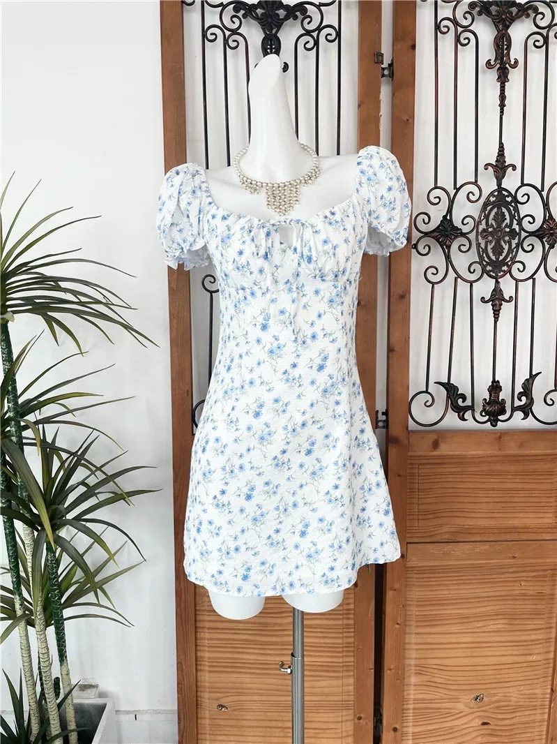 This charming mini dress features a soft white base decorated with delicate blue floral prints, creating a fresh and feminine look perfect for spring and summer. Designed with short puff sleeves and a gathered square neckline with a front tie detail, it offers a romantic, vintage-inspired style. The fitted bodice gently shapes the waist while the slightly flared skirt provides comfortable movement and a flattering silhouette. Lightweight and lined for added comfort, this dress is ideal for casual outings, brunch dates, vacations, or daytime events, pairing beautifully with sandals or heels for an effortlessly elegant outfit.