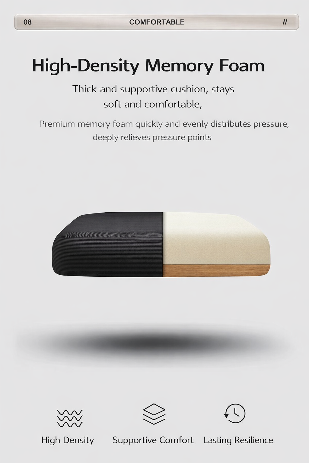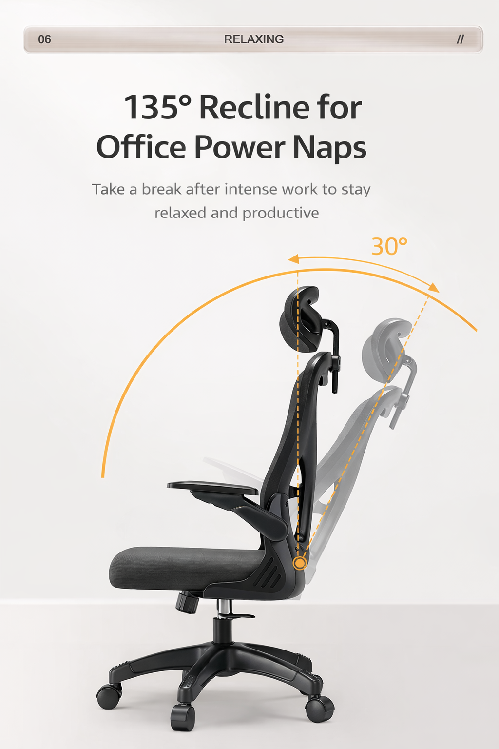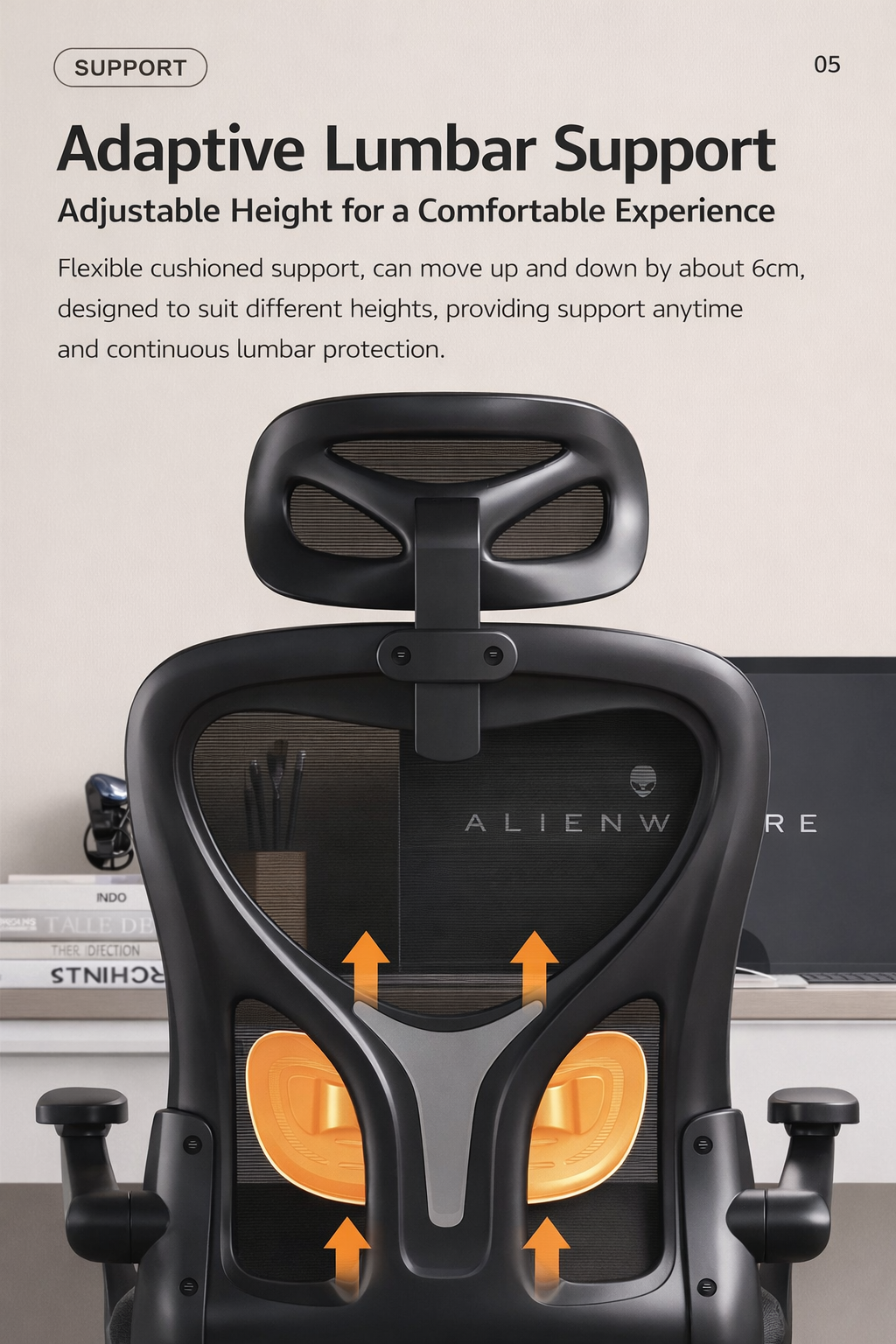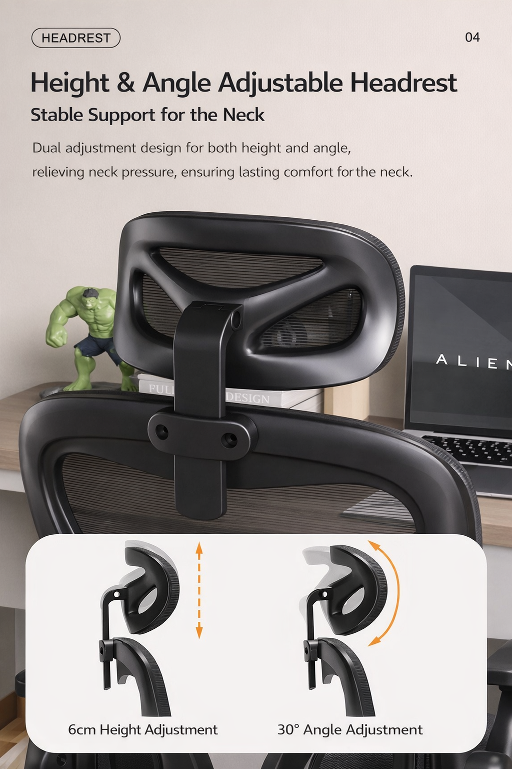 The chair features a height- and angle-adjustable headrest that stabilizes the head and neck, a breathable mesh backrest for airflow and flexibility, and an adaptive lumbar support system that moves vertically to match different body heights. Its high-density memory foam seat cushion evenly distributes pressure, maintaining softness, resilience, and support even during extended use.
