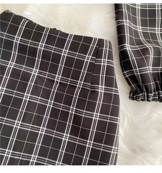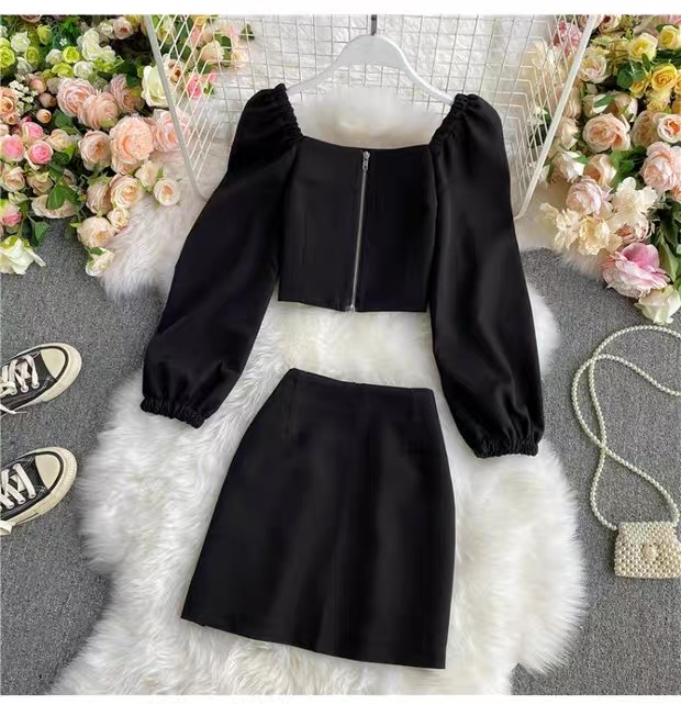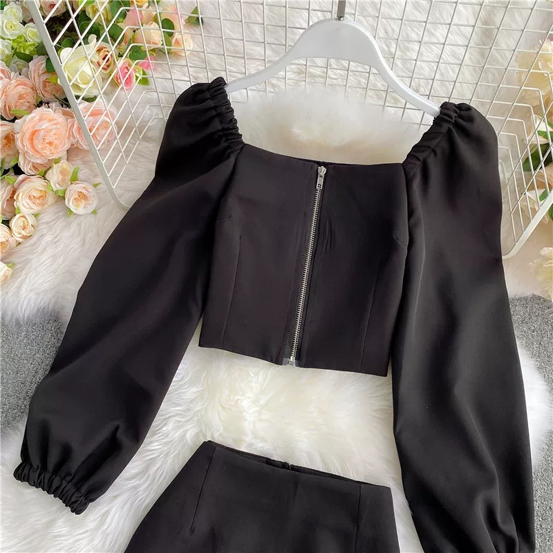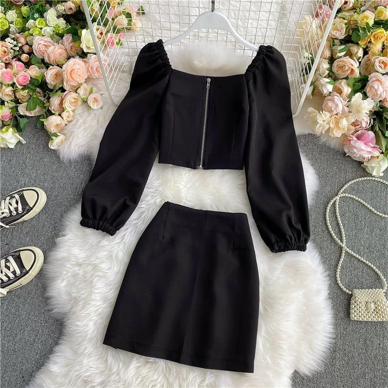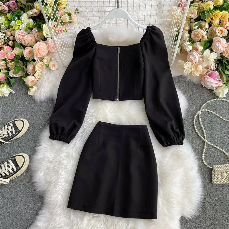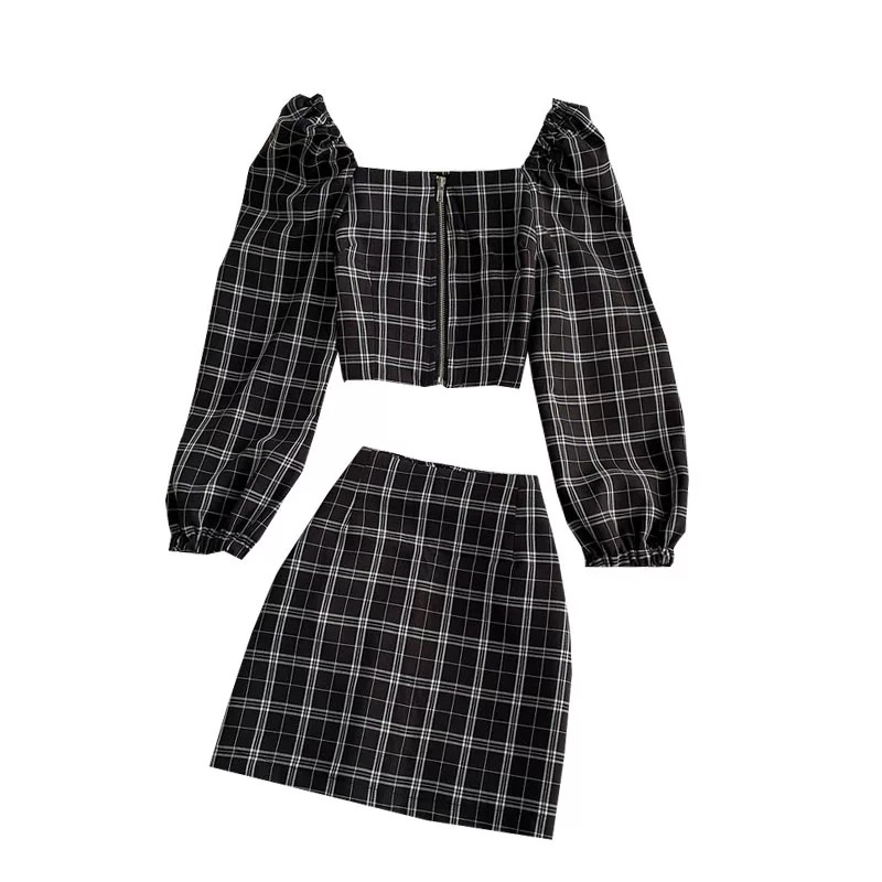 Turn heads with this chic two-piece set available in classic black and stylish black plaid. The black cropped top features a structured fit with a front zipper closure and statement puff sleeves for a bold, feminine look. Paired with it is a matching black mini skirt designed with a clean high-waisted silhouette that flatters your figure effortlessly.