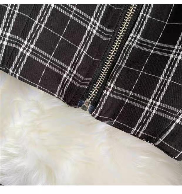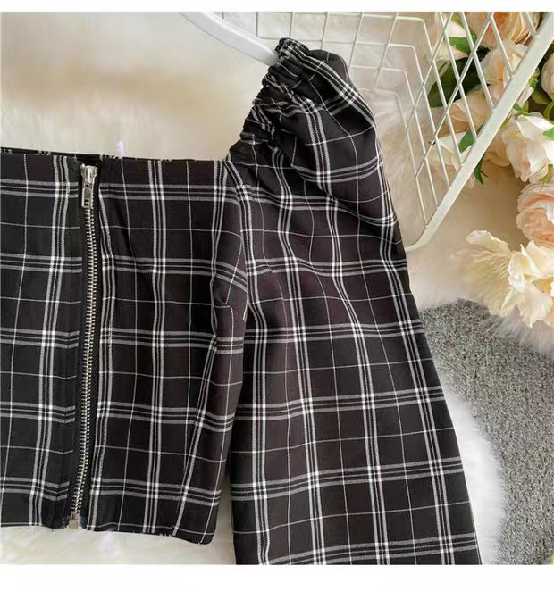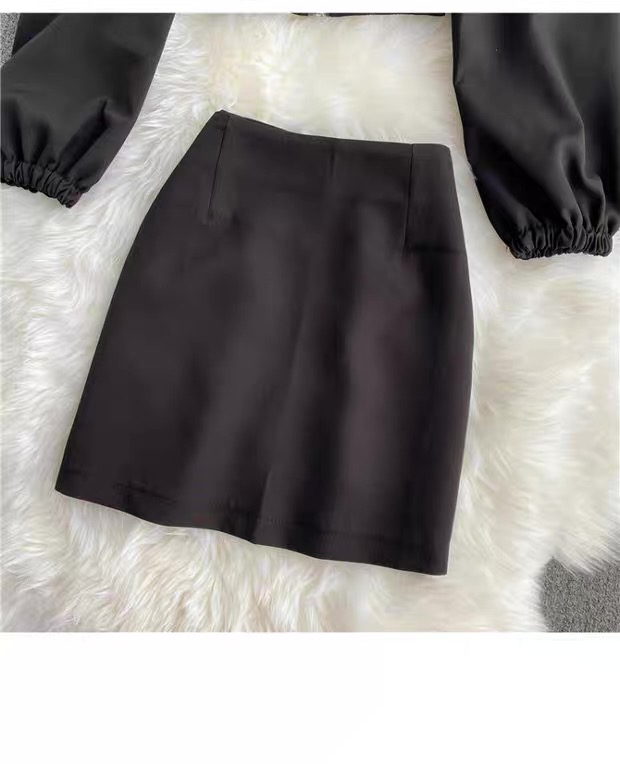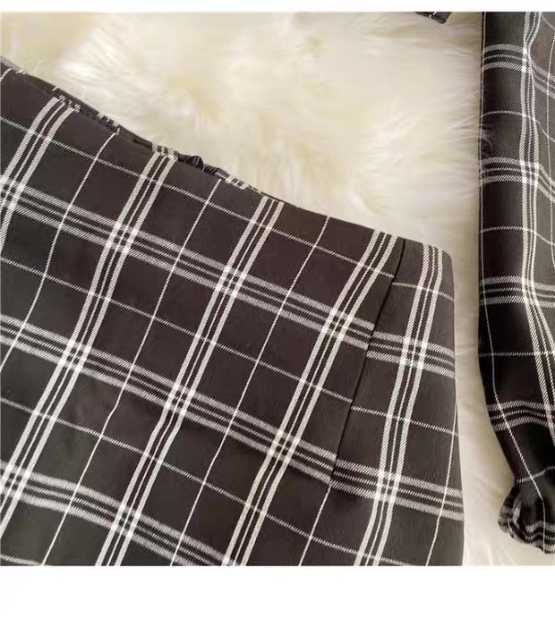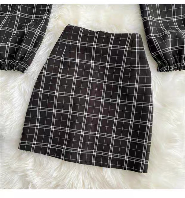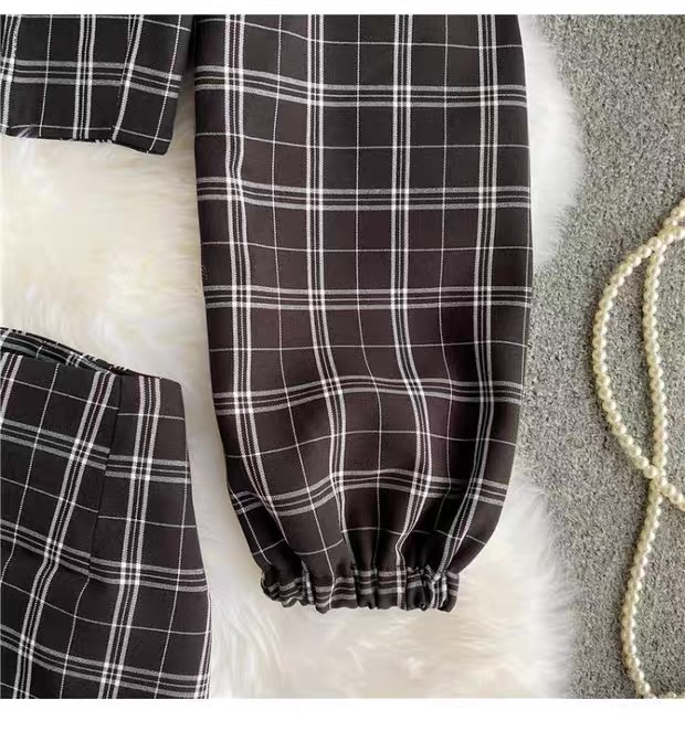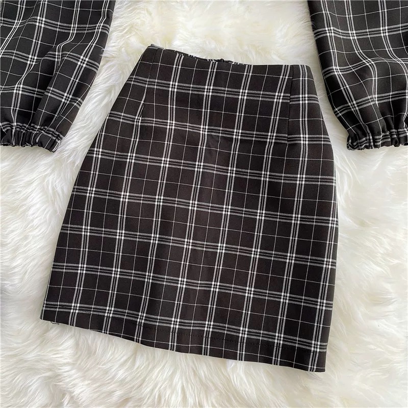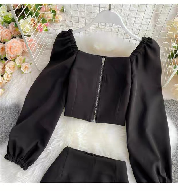 Turn heads with this chic two-piece set available in classic black and stylish black plaid. The black cropped top features a structured fit with a front zipper closure and statement puff sleeves for a bold, feminine look. Paired with it is a matching black mini skirt designed with a clean high-waisted silhouette that flatters your figure effortlessly.