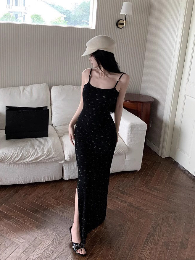 Womens Clothes elegant bodycon maxi dress designed with delicate spaghetti straps and a flattering slim-fit silhouette. Featuring an all-over subtle floral print on a classic black base, this dress hugs the body beautifully while offering a sleek, feminine look. The soft, stretchy fabric provides comfort and flexibility, making it perfect for both casual wear and dressed-up occasions. Ideal for dates, shopping days, evenings out, vacations, or chic everyday styling, this versatile maxi dress pairs effortlessly with heels, sandals, or a light jacket for a modern, confident outfit.