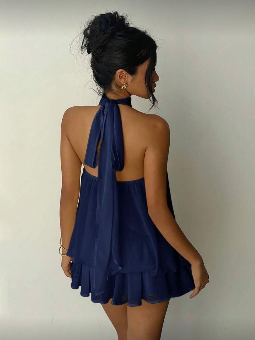 This womens clothes halter neck chiffon mini dress is designed for a soft, elegant, and effortlessly stylish look. Featuring a flattering halter neckline with an open back and tie detail, this dress highlights the shoulders while creating a light, flowy silhouette. The layered chiffon fabric adds movement and a feminine touch, making it perfect for warm weather, parties, vacations, or casual nights out. Its relaxed yet polished fit offers comfort while still giving a chic, slimming appearance. Easy to dress up with heels or keep casual with flats, this piece is a versatile must-have for any modern wardrobe.