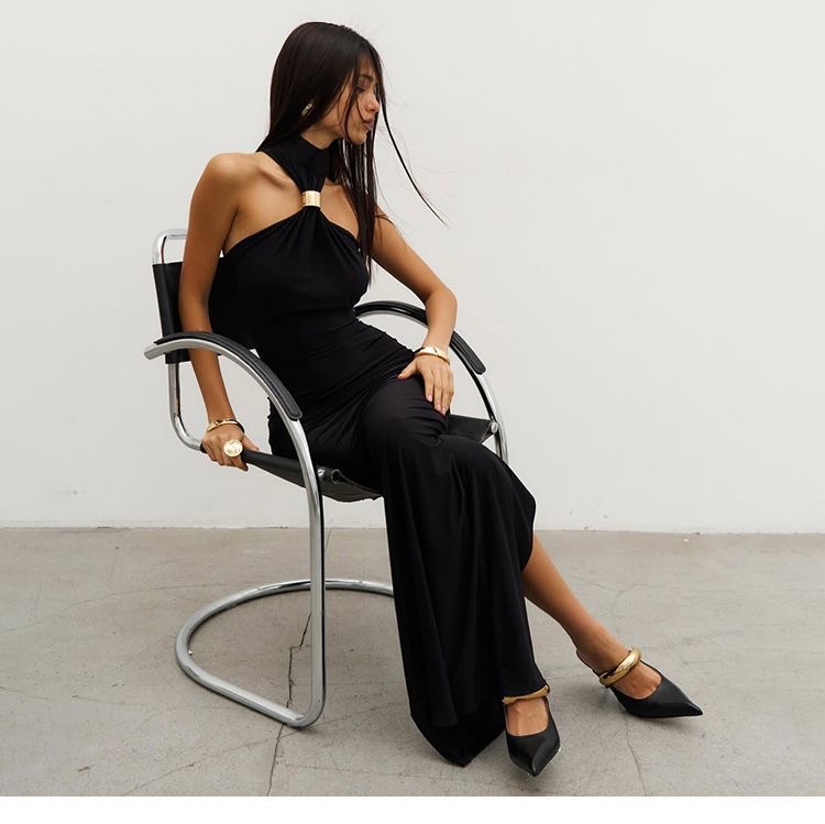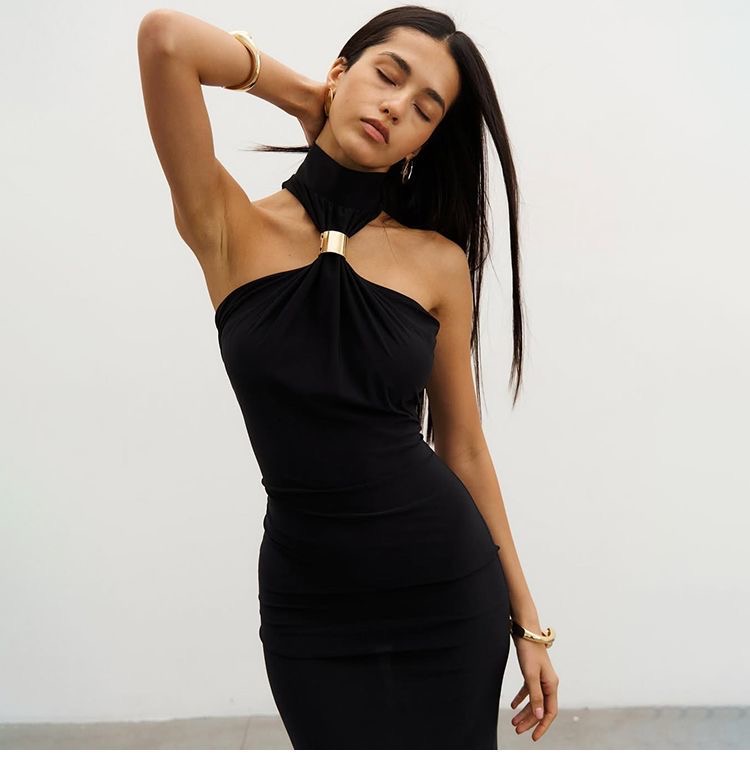 A statement-making womens clothes essential, this halter neck maxi dress features a sleek gold ring detail at the neckline for an elevated, modern look. The body-contouring silhouette flows into a floor-length cut, creating a flattering and elegant profile. Soft, stretchy fabric ensures comfort while enhancing natural curves, making it ideal for evening events, formal occasions, and stylish nights out. Designed to deliver timeless sophistication with a bold edge.
