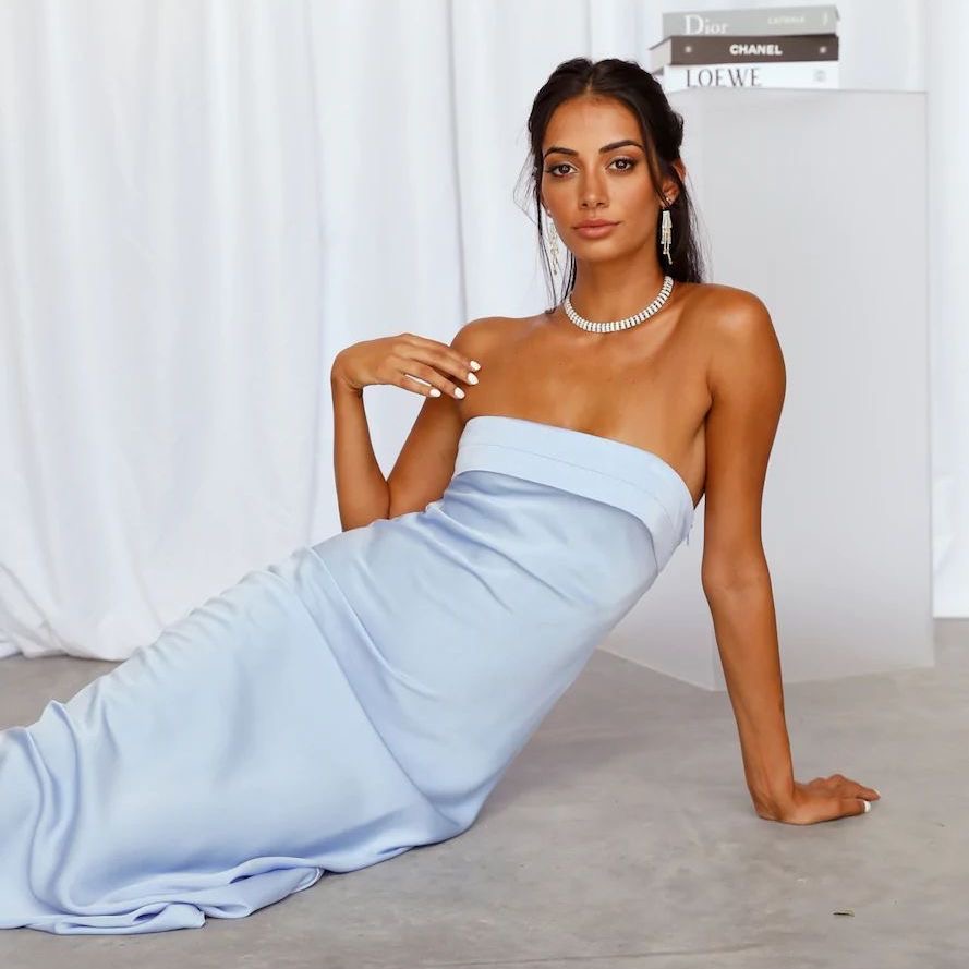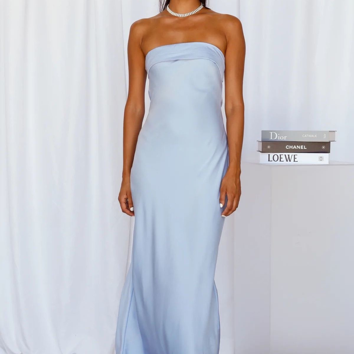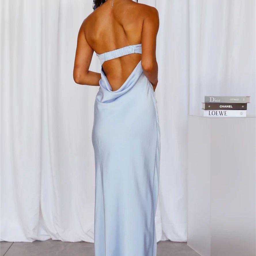 Womens Clothes elegant satin maxi dress designed with a sleek strapless neckline and a smooth, body-skimming silhouette. Crafted from soft, glossy satin fabric, this dress features a subtle backless detail that adds a touch of modern femininity while keeping the look refined and luxurious. The flowing maxi length elongates the figure, creating a flattering and graceful shape. Perfect for weddings, formal events, date nights, vacations, or evening occasions, this timeless dress pairs beautifully with heels and minimal accessories for an effortlessly chic look.