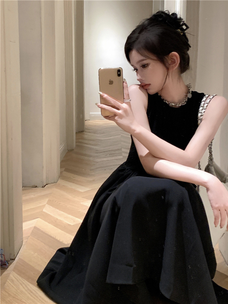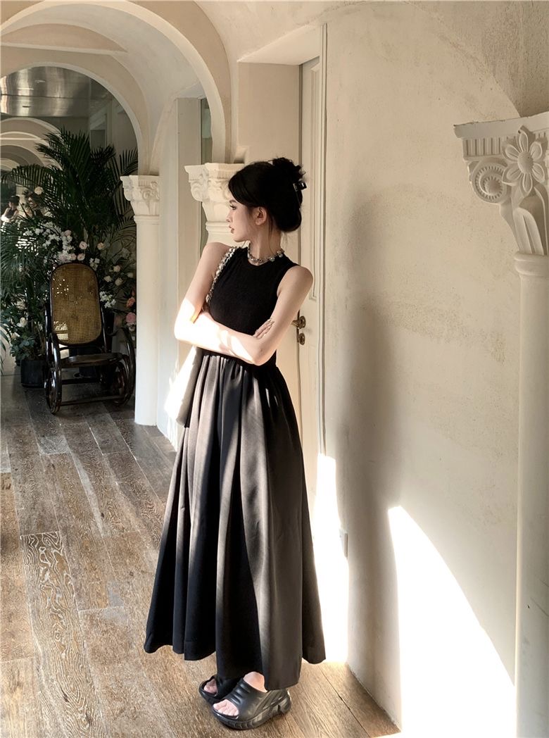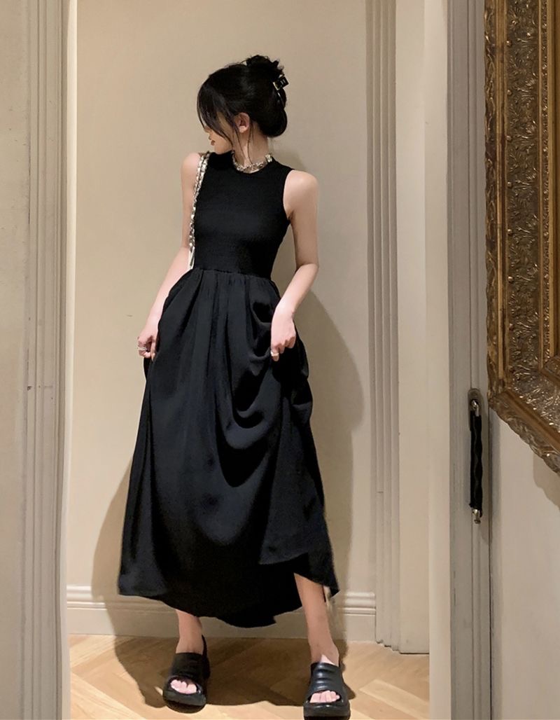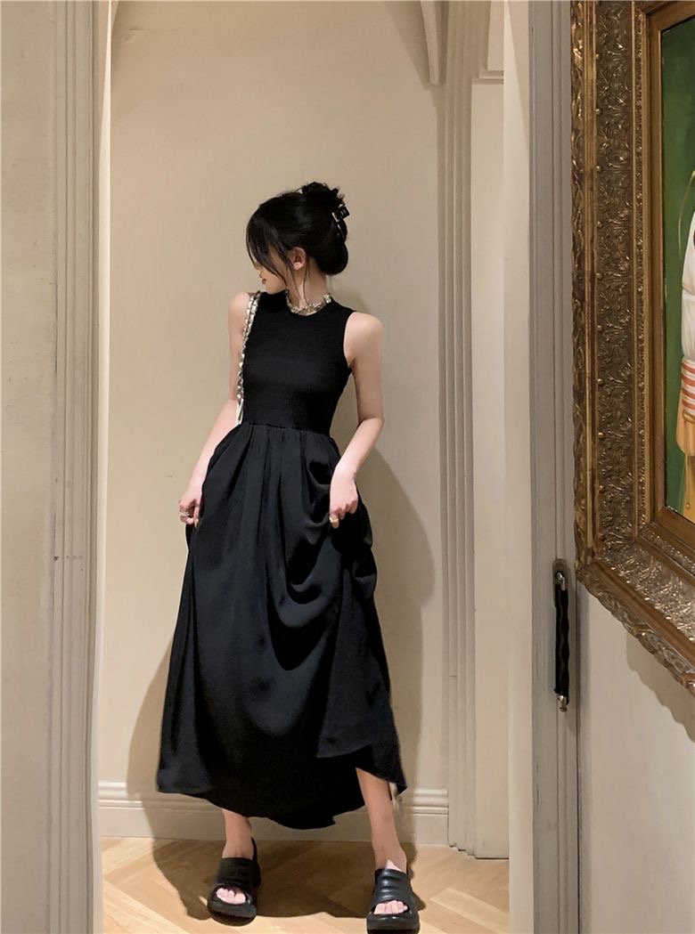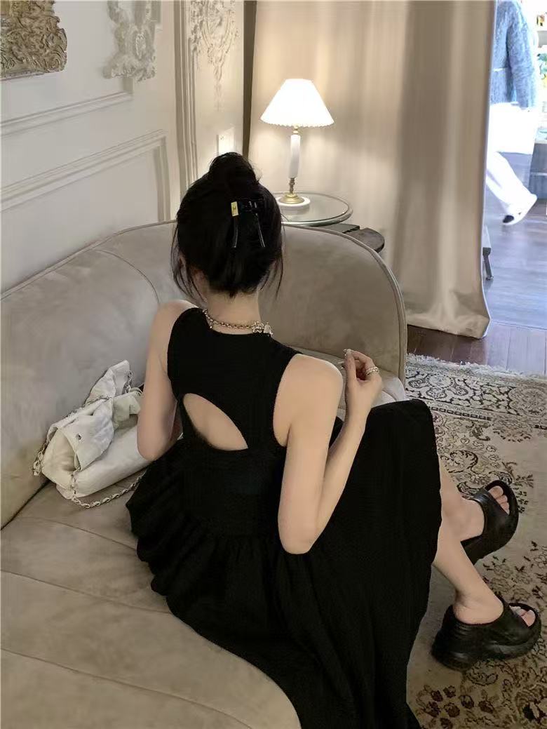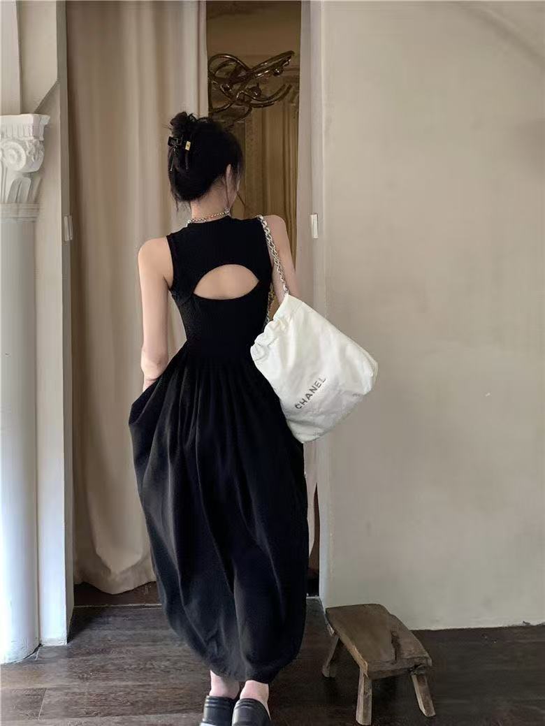 Womens Clothes elegant sleeveless maxi dress designed with a fitted upper bodice and a flowing pleated skirt for a graceful, timeless silhouette. Featuring a high round neckline and a chic open-back cutout detail, this dress blends modern minimalism with classic femininity. The lightweight fabric drapes beautifully, creating soft movement and a flattering shape that enhances the waist while offering comfort. Perfect for formal events, dinners, gallery visits, dates, or stylish everyday wear, this versatile black maxi dress pairs effortlessly with sandals, heels, or statement accessories for a refined, effortless look.