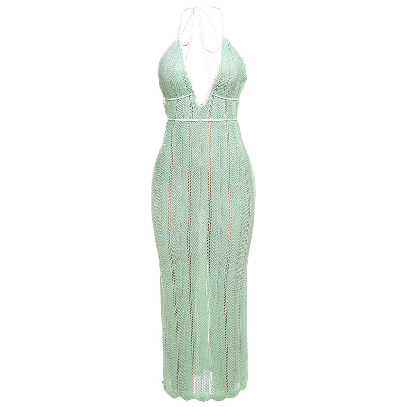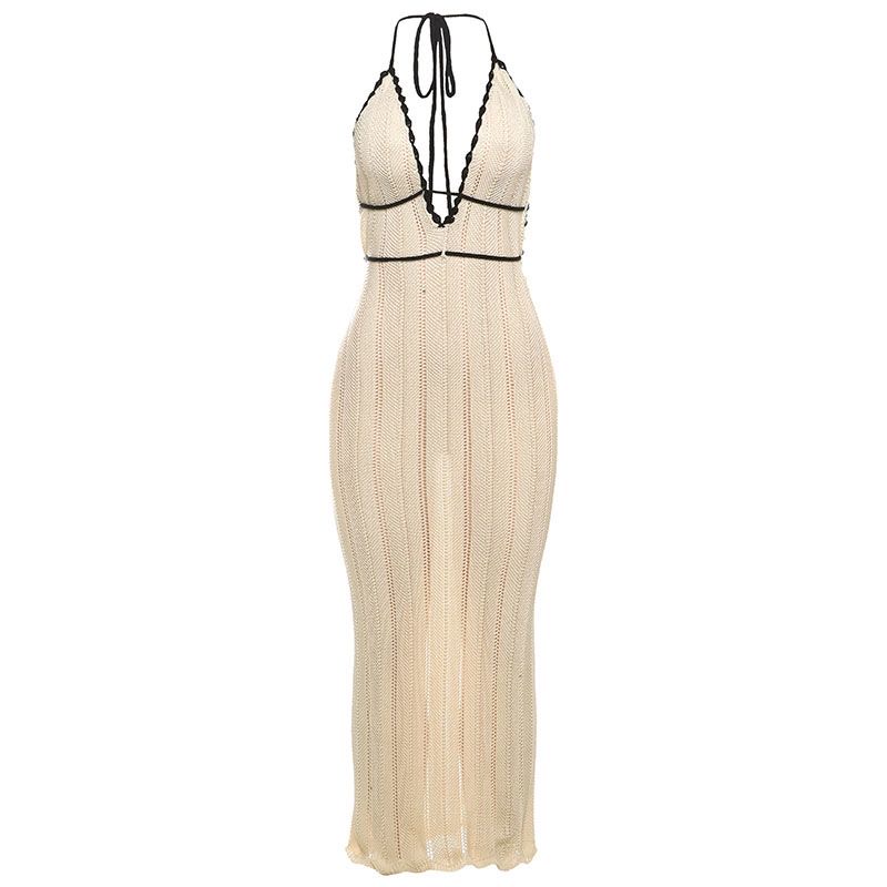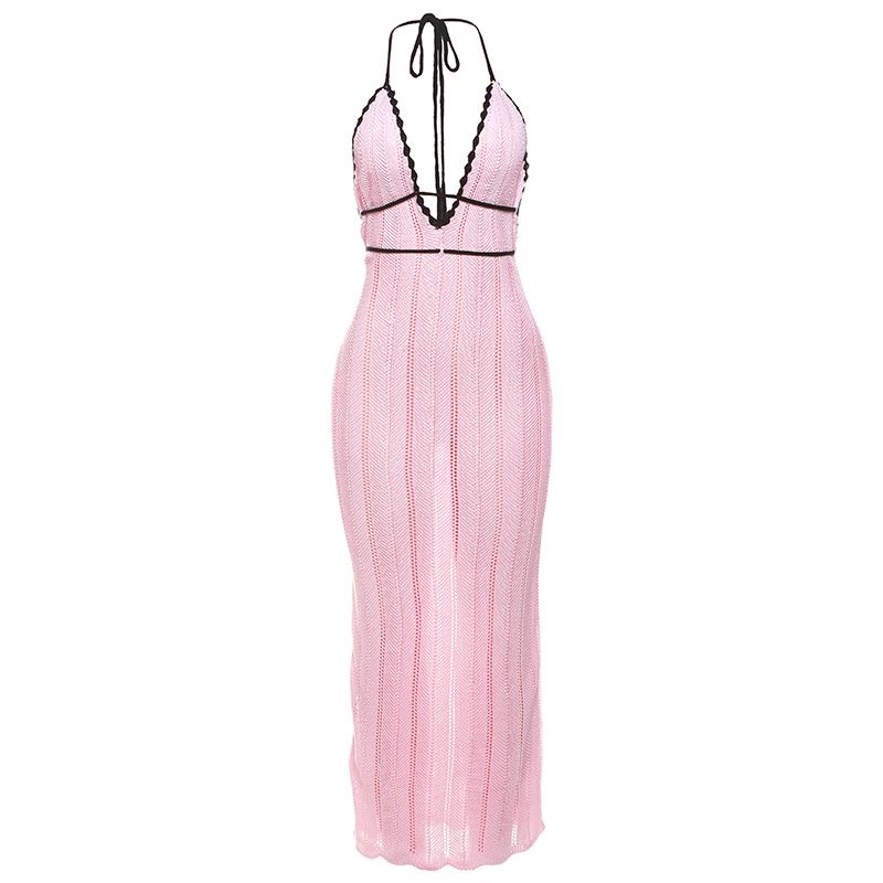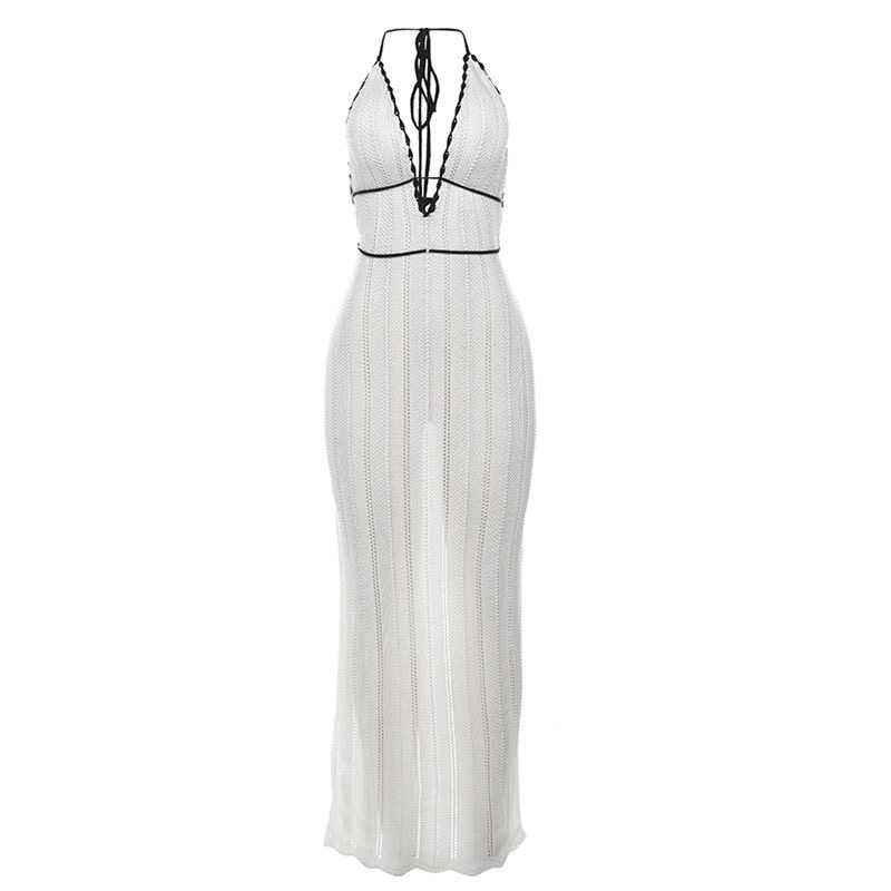 This Womens Contrast Trim Halter Backless Maxi Clothes features a deep V halter neckline with bold contrast edging that defines and flatters the silhouette. Designed with an open back and adjustable tie straps, it offers a sleek, body-hugging fit that flows into a full-length maxi shape. Made from a textured, lightweight fabric, this piece is perfect for summer outings, vacations, city walks, and statement day-to-night looks.