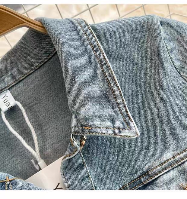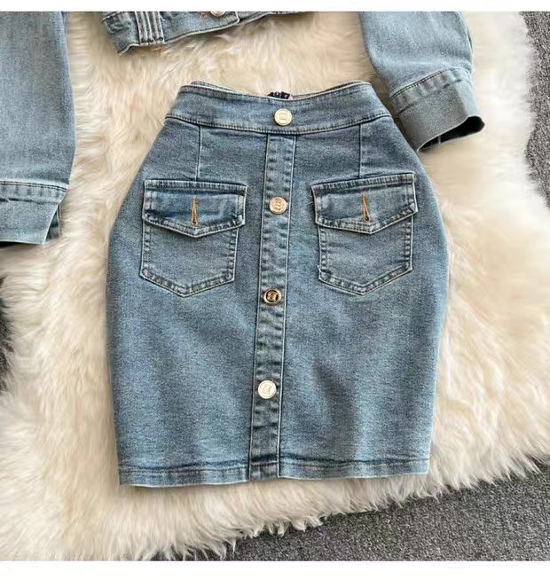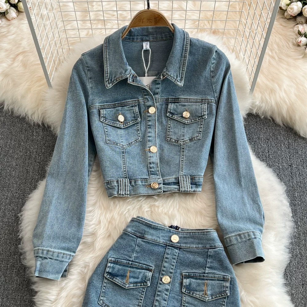 This stylish two-piece denim set features a cropped long-sleeve jacket with a classic collar, front button closure, and chest flap pockets, paired with a high-waisted mini skirt designed with matching button details and functional pockets for a coordinated look. The structured fit of the jacket enhances the silhouette, while the skirt offers a flattering shape that’s perfect for casual outings or trendy streetwear styling. Crafted from durable yet comfortable denim fabric, this set blends timeless design with modern appeal. The set comes in a light blue denim color, giving it a fresh and versatile finish suitable for various occasions.