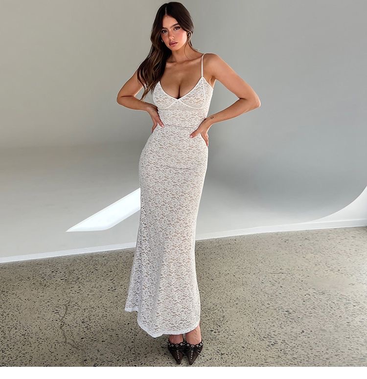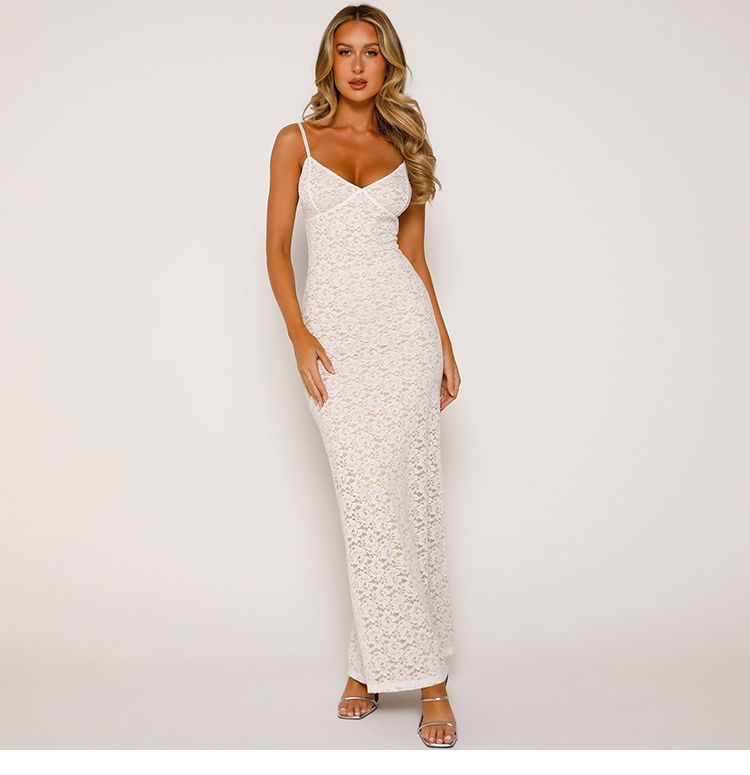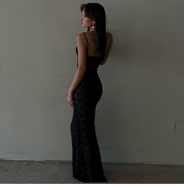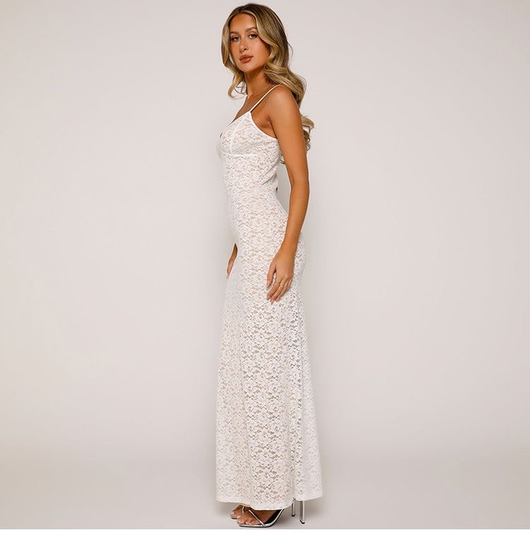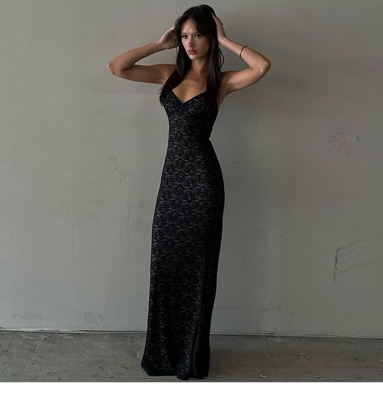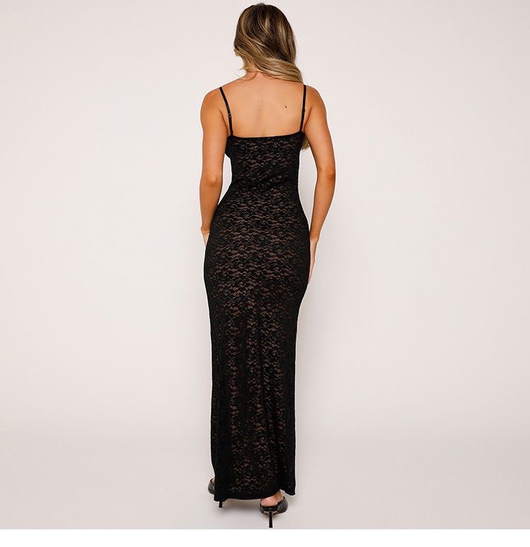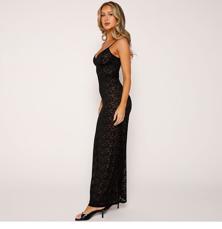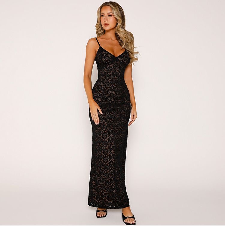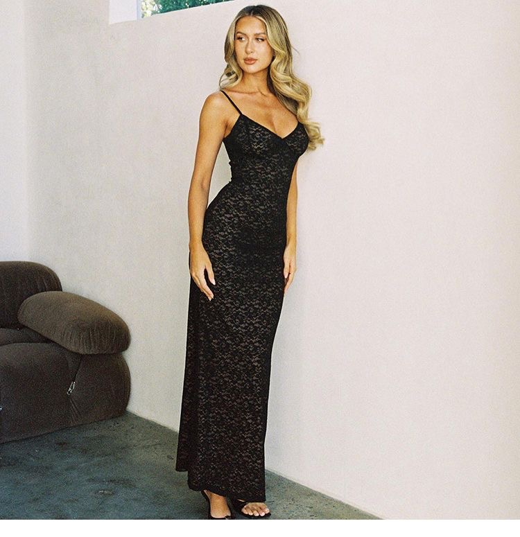 This womens lace maxi dress clothes features a delicate all-over lace design with a flattering slim-fit silhouette that enhances natural curves. Designed with adjustable spaghetti straps and a soft V-neckline, it offers a feminine and elegant look perfect for evening wear, parties, weddings, or special occasions. The lightweight lace fabric drapes beautifully to ankle length, creating a graceful flow while remaining comfortable to wear. Available in classic colors, this dress pairs effortlessly with heels and minimal accessories for a timeless, sophisticated outfit.