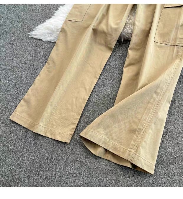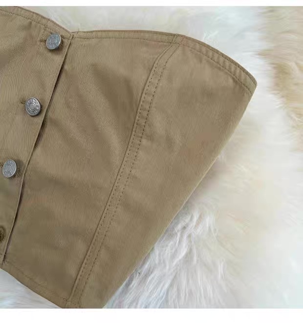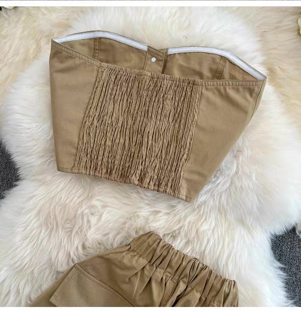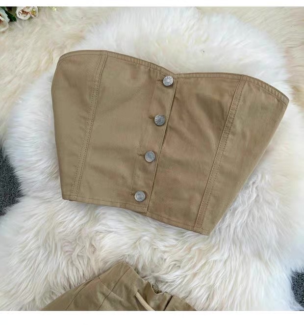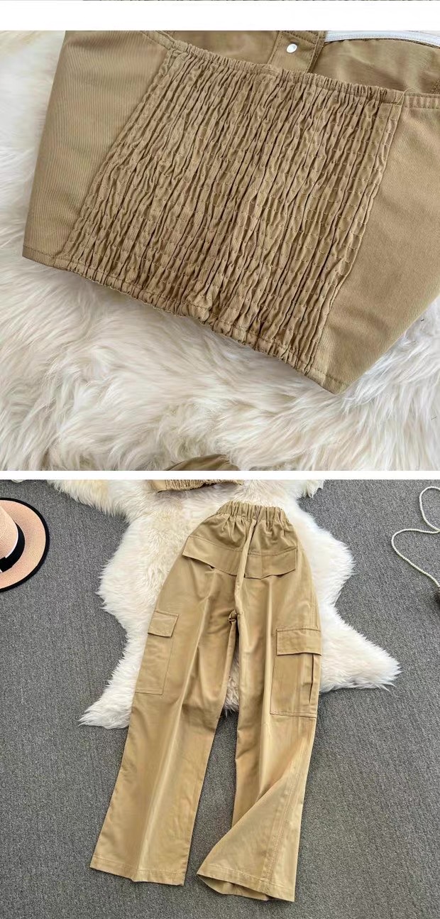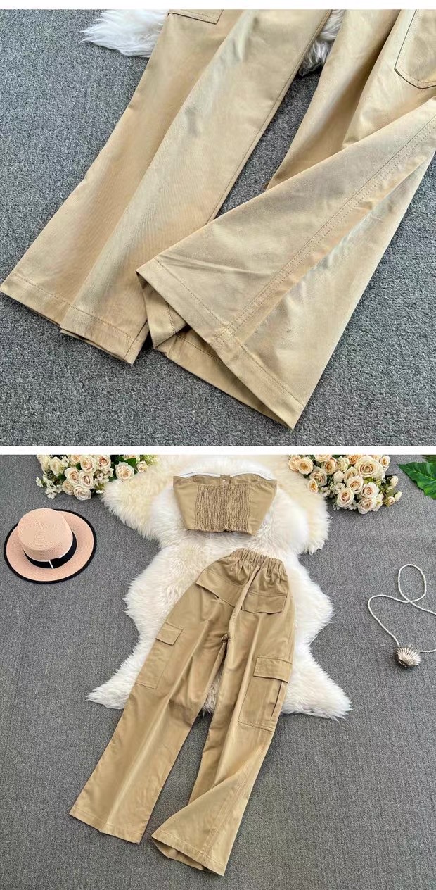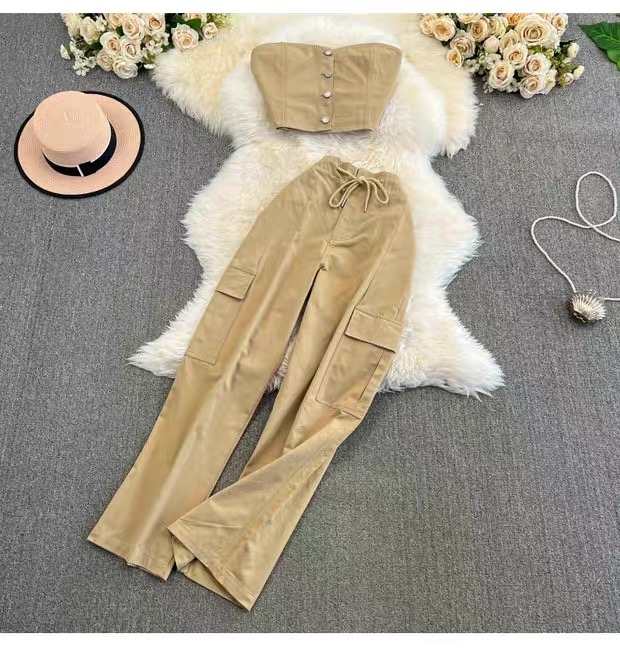 This trendy two-piece set features a structured strapless crop top with front button detailing and a stretchy smocked back for a secure and comfortable fit, paired with high-waisted cargo-style flared pants. The pants include an adjustable drawstring waist and functional side pockets, combining practicality with a stylish silhouette. The flared leg design adds a modern touch, making the outfit perfect for casual outings or streetwear looks. The set comes in a chic khaki color, offering a versatile and effortlessly fashionable appearance.