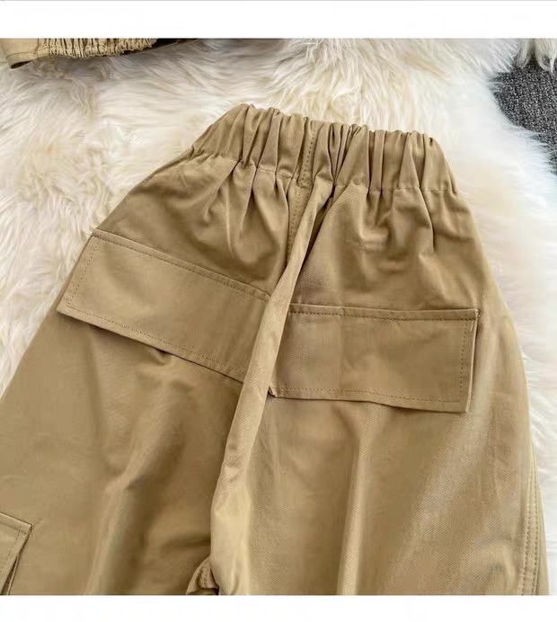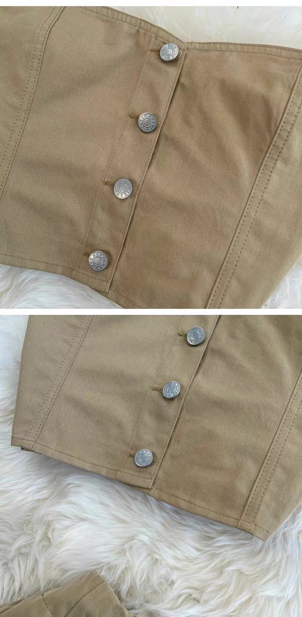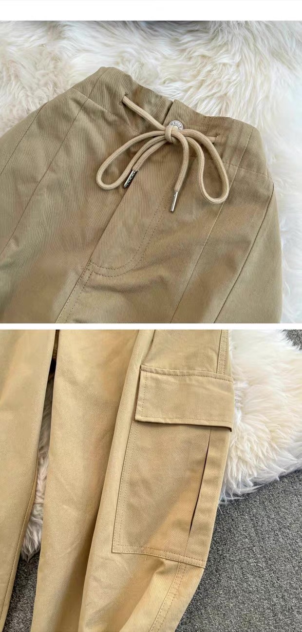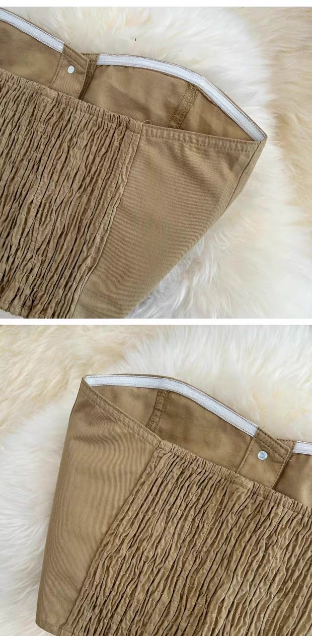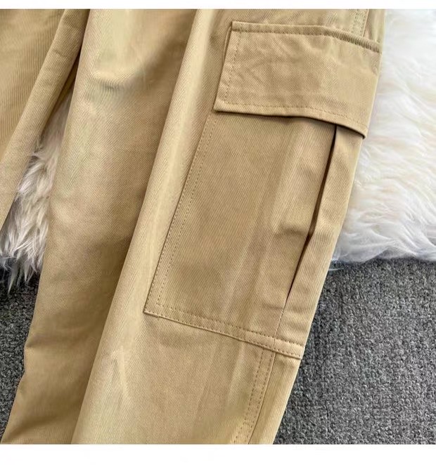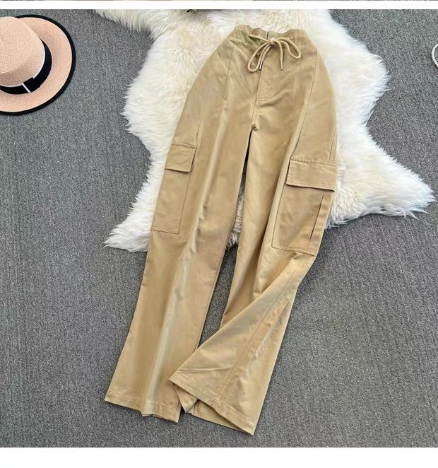 This trendy two-piece set features a structured strapless crop top with front button detailing and a stretchy smocked back for a secure and comfortable fit, paired with high-waisted cargo-style flared pants. The pants include an adjustable drawstring waist and functional side pockets, combining practicality with a stylish silhouette. The flared leg design adds a modern touch, making the outfit perfect for casual outings or streetwear looks. The set comes in a chic khaki color, offering a versatile and effortlessly fashionable appearance.